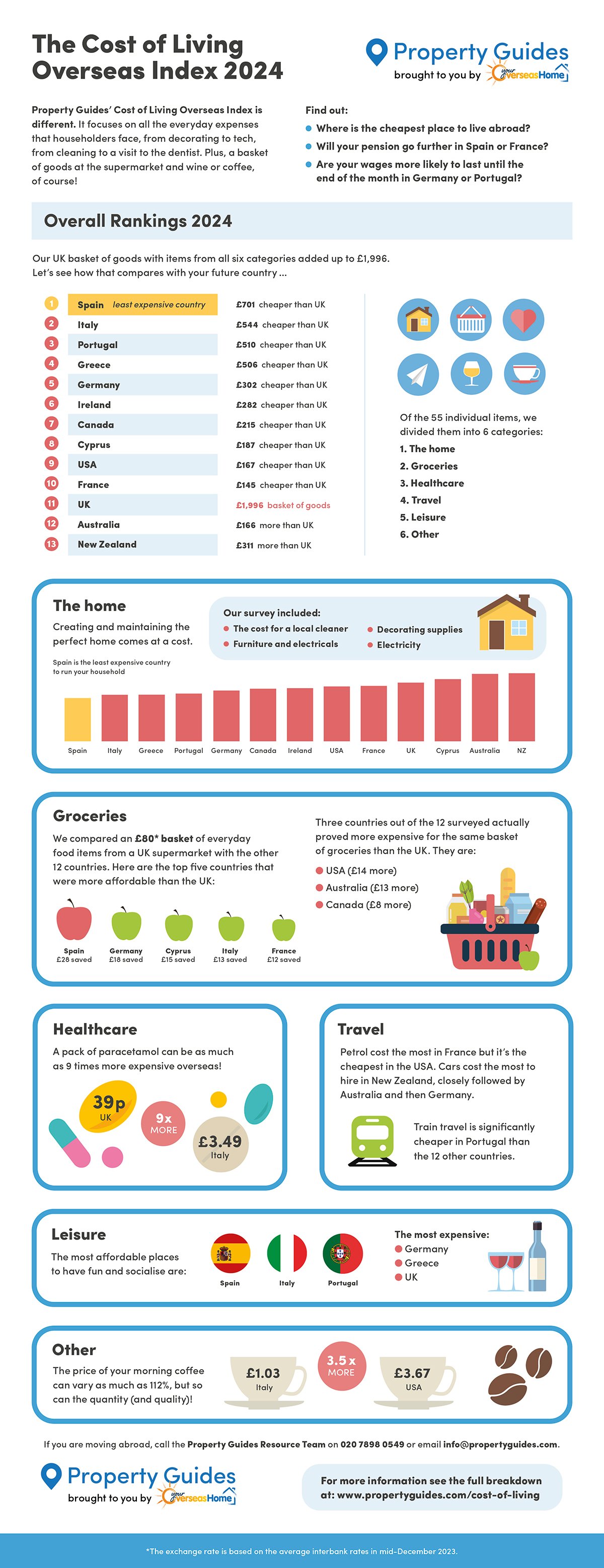 The Cost of Living Overseas Index from Property Guides has the answers. The 2024 index compares the prices of these items across 13 countries. Including the UK, Ireland, France, Spain, Germany, Italy, Greece, Cyprus, Portugal, the USA, Canada, Australia and New Zealand.